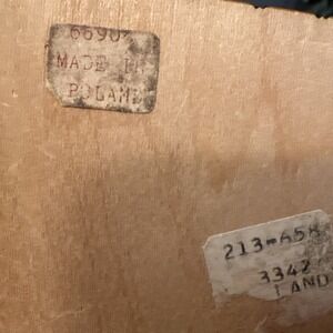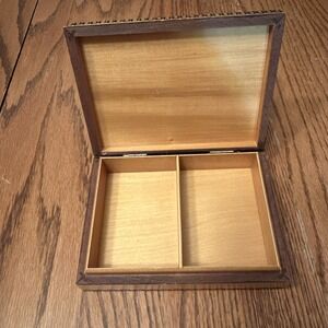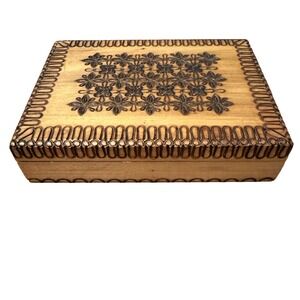 Handcrafted wooden trinket box features intricate pyrography and carved floral patterns on the lid, showcasing traditional Polish folk art. The interior is divided into two sections, making it ideal for organizing jewelry, keepsakes, or playing cards. This vintage piece is made of light-toned wood with dark burnt-etching details and a hinged lid for secure storage. This item is in excellent vintage condition with minimal signs of wear consistent with age.
