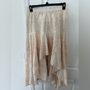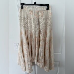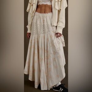Lace panels and eyelet details make this asymmetrical maxi skirt an absolutely head-turning piece.
