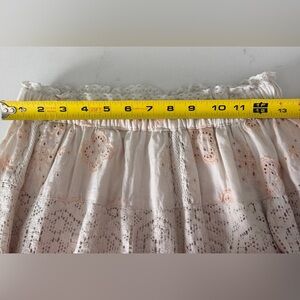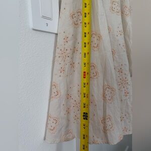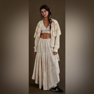 A flowy cream eyelet maxi skirt with delicate embroidered cutouts. Soft drape and breathable fabric for all-day comfort. Versatile cream color pairs easily with casual or dressy tops.