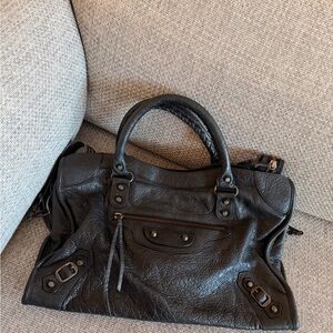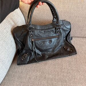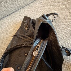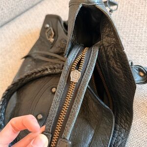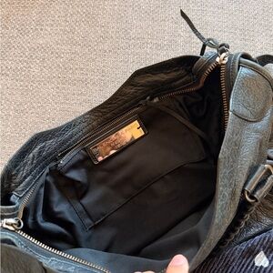 Leather is soft with visible wear, creasing, Interior clean. Hardware shows normal wear. No major structural damage.