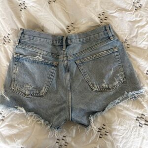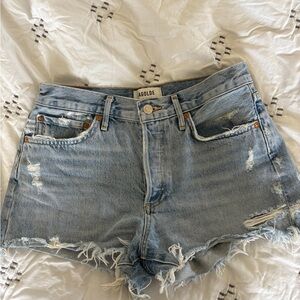 Agolde high-rise denim shorts. Light blue wash with distressed details and frayed hem. Classic five-pocket style with button fly. Casual, worn-in look ready for everyday wear.