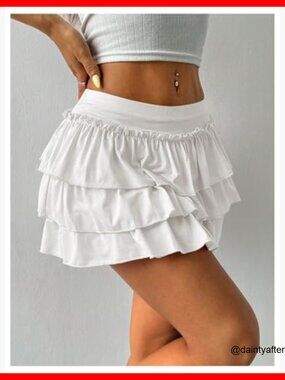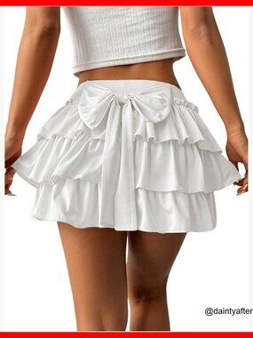 A low-waist pull-on mini skirt featuring a decorative bow back and a layered ruffle hem. Perfect for casual outings, travel, parties, and daily wear, offering a cute and elegant look with a comfortable, stretchy fit.