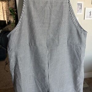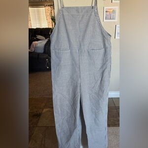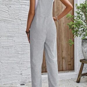 Effortless NEW wide-leg jumpsuit in a subtle gray stripe. Lightweight fabric and relaxed fit for all-day comfort. Easy pull-on design with a clean, modern silhouette. Perfect for casual weekends or dressed-up summer outings. Tie straps make for adjustable fit. Size small. Smoke free home. Blackish gray pinstripes