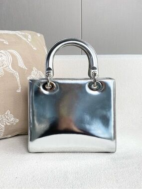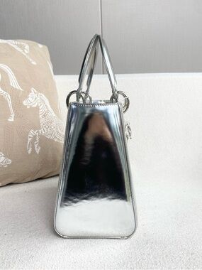 Elegant silver Lady Dior tote in glossy patent leather. Signature Dior charms and structured top‑handle design with detachable strap for shoulder or crossbody wear. The sleek silver finish adds a modern, polished touch to any outfit.