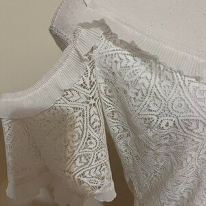 Delicate cream lace top with a V-neck and cold-shoulder sleeves. Feminine ruffle trim along the neckline and shoulders. Lightweight, breathable lace fabric with an intricate pattern. Versatile style for casual or dressy occasions.