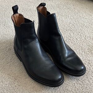 Classic Chelsea boot silhouette. Smooth black leather upper with elastic side panels. Pull tabs for easy on and off. Stitched welt and rubber sole. Sleek, versatile style for daily wear.