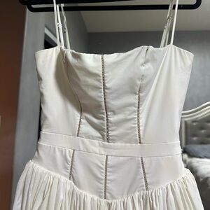 Elegant white midi dress with thin straps and a structured, fitted bodice. Soft, flowing skirt creates a flattering silhouette. Minimal, timeless design ideal for daytime events or summer evenings. Comfortable and breathable fabric for easy wear.