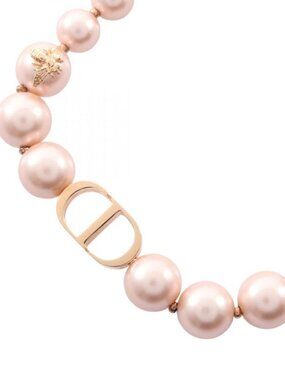 This is an authentic Dior necklace in a lustrous gold-tone finish. The necklace features a series of round, pink-hued pearls punctuated by a sparkling bee-shaped charm, creating a delicate and elegant design.