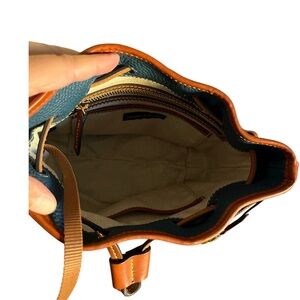 Elegant tote with Dooney & Burke ‘Jeans’ Blue Leather Pebble Grain exterior. Tan leather accents and handles.