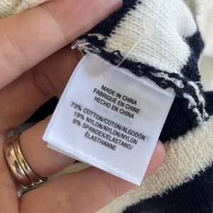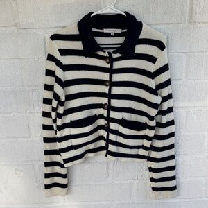 Chic navy and white striped cardigan with button-up front. Features a stylish collar and pocket detail.