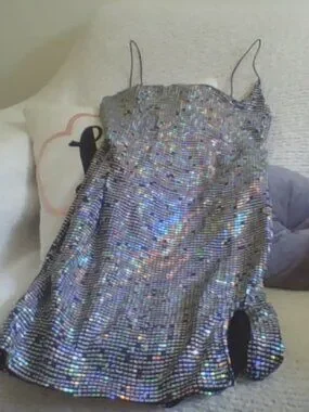 Hii! This is a silver sequin dress in the size small. It features spaghetti straps, chainmail detailing, sweetheart neck, fitted waistline, straight hem, above-knee length.