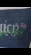 Design: Rich dark wash denim exterior with a heavy rhinestone "bling" logo and floral details.