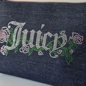 Upgrade your vanity or travel game with this stunning Juicy Couture denim cosmetic pouch! This bag features the iconic "Juicy" script in shimmering silver rhinestones, accented by beautiful pink and green rhinestone rose motifs for a perfect Y2K aesthetic. Add this classic piece to your collection today. 💖