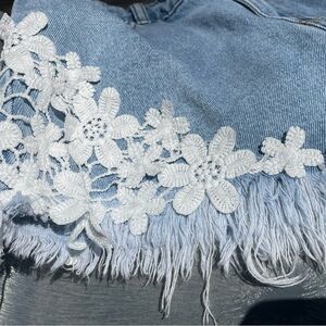 SHEIN Blue Denim Lace Trim Fringe Shorts