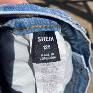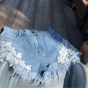 High-rise denim shorts with floral lace appliqué along the sides. Fringed raw hem for a playful finish. Classic five-pocket styling and belt loops. Soft medium-blue wash for easy styling. THIS SIZE IS FOR A 12 YOUTH