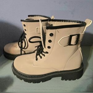 Chunky lug sole Chelsea ankle boots by Dream Pairs. Smooth tan upper with elastic side panels. Decorative metal buckle strap detail. Thick block heel for stability. Casual yet edgy style for everyday wear. Thick heel provides cushion and comfort for all day wear.