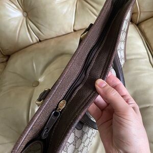 Handsome authentic vintage Gucci business bag. Exterior is in great condition with no issues. The coating on the inside lining is starting to shed a bit as typical for these vintage Gucci bags. Musty scent due to age, circa 1980's. Approx size 15x9.5x3.5