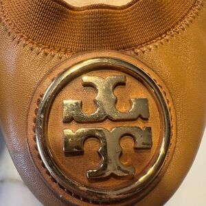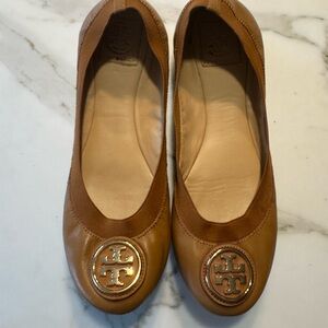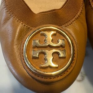 Smooth chestnut leather ballet flats. Elasticized topline for comfortable wear. Gold-tone Tory Burch logo medallion at the toe. Sleek, versatile silhouette for daily looks. Worn and loved!