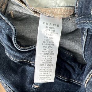 The FRAME Denim Le Crop Mini Boot Stretch Denim Jeans in size 28 are a stylish and versatile addition to any woman's wardrobe. Featuring a dark wash and a slim fit, these cropped jeans have a raw hem and a 5-pocket design, adding a touch of edginess to the classic denim look. Made from a comfortable cotton blend with added stretch, these jeans are perfect for all seasons and can be easily machine washed for convenient care. Whether you're dressing up for a night out or running errands during the day, these Frame Denim jeans are a must-have for any fashion-forward woman.
