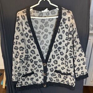 Soft leopard print cardigan with a relaxed fit. Features black trim, front pockets, and button-front closure. Versatile layering piece that pairs well with jeans or dresses. Comfortable knit in black and cream.