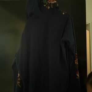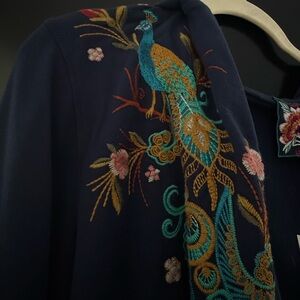 Navy bomber-style jacket featuring a detailed embroidered peacock motif. Bright threadwork in teal, gold, and pink accents. Full front zipper and hoodie neckline. Adds artistic flair to casual outfits.