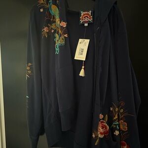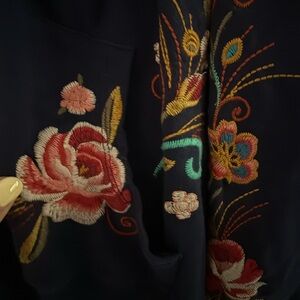 Johnny Was Navy Bomber Jacket with Embroidered Peacock