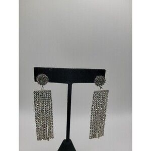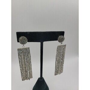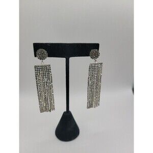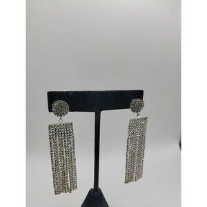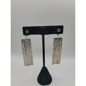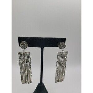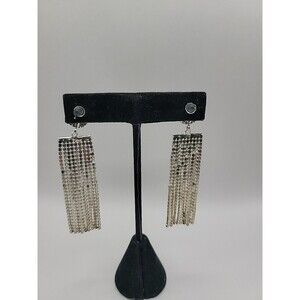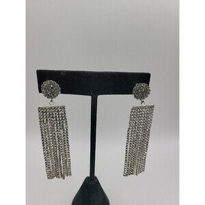 Vintage Silver Tone Rhinestone Tassel Fringe Dangle Earrings Glam Cocktail