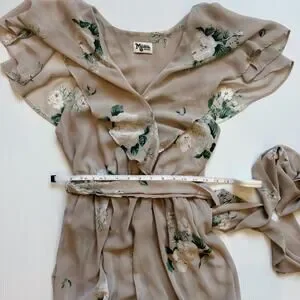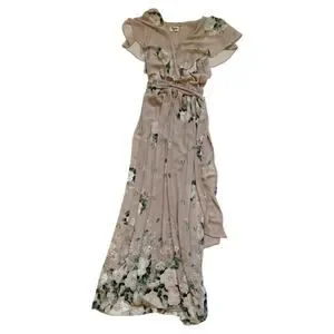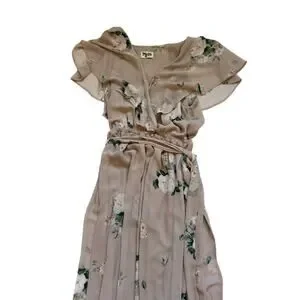 Flowy beige floral chiffon maxi dress with wrap-style ruffle bodice, flutter sleeves, tie waist, and romantic garden party silhouette—perfect for cottagecore, coquette, bridesmaid, wedding guest, spring pastel, Easter, graduation, feminine soft aesthetic.