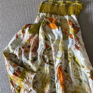 Sleeveless maxi dress with thin straps. Fitted bodice and flowing skirt. All-over scenic print in warm tones. Lightweight, breezy fabric for summer days. Feminine and relaxed silhouette.