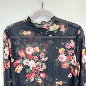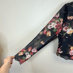 Sheer black floral mesh long-sleeve crop top. Lightweight, breathable fabric with an all-over pink, red, yellow and cream floral print. Delicate ruffled edges add a feminine finish. Easy to layer for day or night looks. No brand or fabric tags.