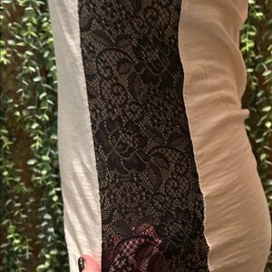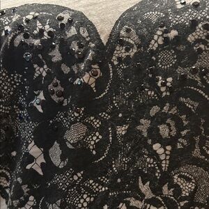 EXPRESS tee featuring a black lace & bead heart design. Shear lace side & shoulder panels. XS. Smoke-free home.