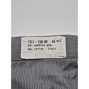 Label and code details: Interior waistband features an Asher Reserve brand label, a Christopher Kim's Men's Wear Custom Tailoring Washington D.C. label, and a woven DRY CLEAN MADE IN U.S.A. tag; interior paper tag lists 1311-150-09, 44 REG, 62% WORSTED WOOL, 38% COTTON - ITALY, and a printed $195.00 price.