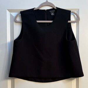 Minimal sleeveless tank from Club Monaco. Boxy, slightly cropped silhouette. Smooth, structured fabric with a clean neckline. Versatile piece for work or layered looks.