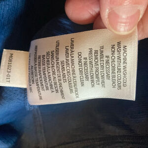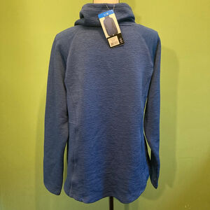 This is a new with tags Tuff Athletics women's cowl neck sweatshirt in size L/G, featuring a textured blue fabric. The sweatshirt has long sleeves with raglan seams and a drawstring at the cowl neck. It includes two side pockets, as shown in one of the images. The care tag indicates it is made of 97% polyester and 3% spandex, with 100% polyester inner filling, and is machine washable. The garment was made in Cambodia.