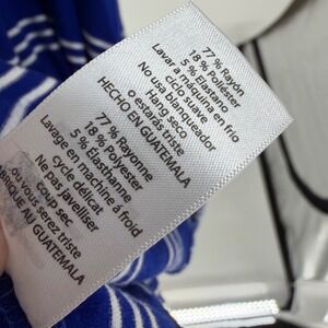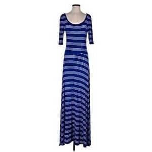 Soft jersey knit maxi dress features a classic nautical-inspired horizontal stripe pattern in royal blue and white. Designed with a flattering scoop neckline and short sleeves, this floor-length piece offers a comfortable stretch fit that moves with you. The lightweight rayon-blend fabric ensures breathability, making it a versatile staple for effortless daily wear. This dress is perfect for casual weekend outings, beach vacations, or a relaxed garden party.