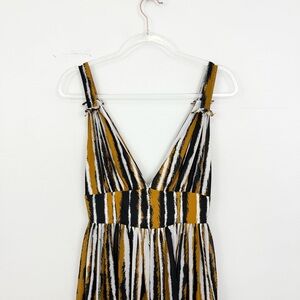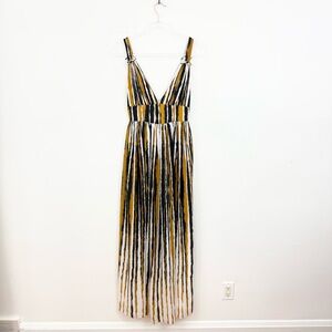 DESCRIPTION: Ronny Kobo Sallee Striped Pleated Plunge Neck Maxi Dress. Dramatic deep V-neckline, pleated full-length skirt, and an eye-catching paint-stroke stripe print in black, gold, and white. Adjustable shoulder ties add a feminine touch while the wide waistband creates a flattering, elongated silhouette. Fully lined for comfort with a concealed side zipper. Perfect for weddings, vacations, events, or any occasion where you want to stand out.