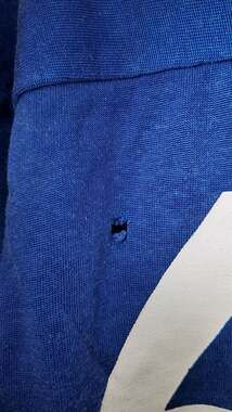 This is an authentic piece of vintage athletic wear, featuring a heavy-duty knit construction and classic felt or heat-pressed numbering. With its 3/4 length sleeves and rich royal blue color, this jersey is perfect for collectors of vintage Americana or those looking for a unique, high-character layering piece.