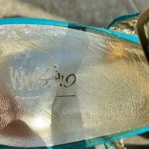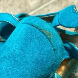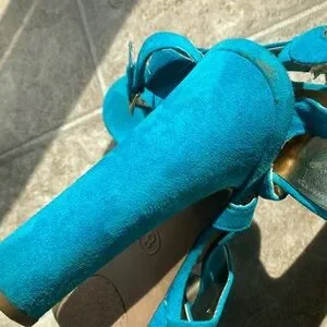 Mossino Turquoise Suede Platform Sandals Heels Size 8 features stylish turquoise suede platform sandals with a secure ankle buckle. Soft suede straps offer comfortable support and a bold pop of color. Versatile design perfect for dressing up casual and evening looks. (Please Note: small stains on heel, inner gold sole lifting around edges. Unnoticeable while wearing. Price adjusted to reflect. Offers welcome)