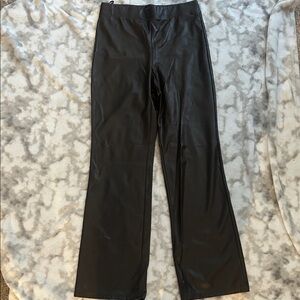 High-rise faux leather mocha brown pants with a smooth finish. Figure-skimming through the hips. Sleek, versatile dark brown tone for polished outfits. Pairs well with knit tops or blazers.