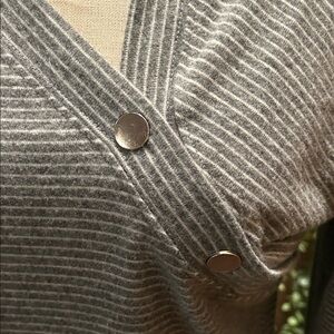 Casual striped gray women's top. Asymmetrical neckline with silver button trim. Super soft & comfy. Medium. Smoke-free home.
