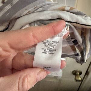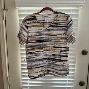Alfred Dunner short sleeve shirt with horizontal brushstroke stripes. V-neck with small button detail. Soft, airy knit for comfortable wear. Easy to pair with casual bottoms. 19” pit to pit.