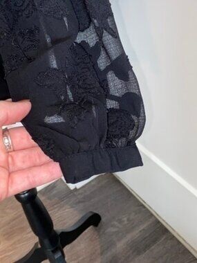 Sleeves Are sheer with a floral pattern and capped sleeves at the wrist with a button closure.