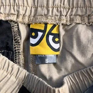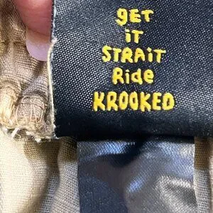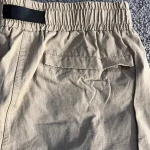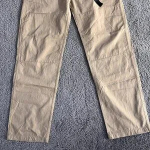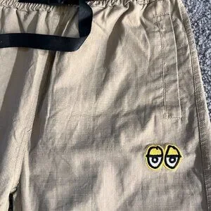 The listing is for a pair of Krooked Eyes men's pants in size small, featuring a ripstop design with double knees for added durability. The pants are in khaki beige color and come with a built-in belted style for a comfortable and secure fit. Perfect for casual wear,