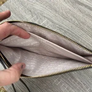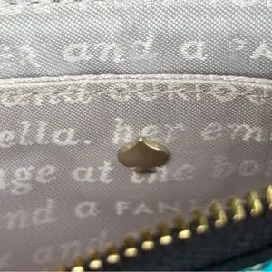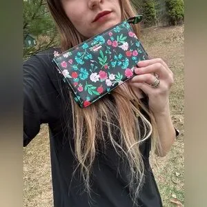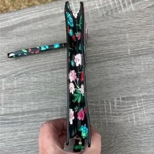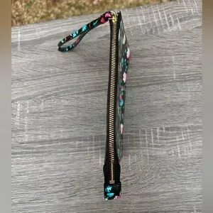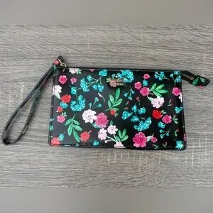 Kate spade wristlet with glossy floral print. Top zip closure and attached wrist strap. Compact and stylish for day or night.