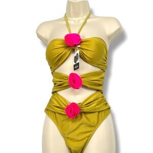 SWMMER LIKET NWT Olive Color Two Cut Out Halter Tie One Piece Swim Suit S