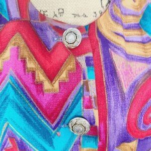 DETAILS: dry clean only. made in USA. shoulder pads. super fun and colorful button front lighter weight jacket. ornate buttons