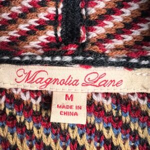 Magnolia Lane open front cardigan showcases a vibrant Southwestern geometric pattern in a bold palette of red, black, blue, and cream. This mid-length knit features a relaxed shawl collar, functional front patch pockets, and a single decorative button detail. The heavy-weight acrylic knit provides warmth and durability, making it an ideal layering piece for transitional weather or cozy indoor wear.