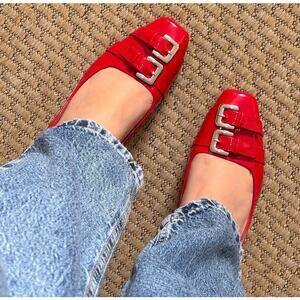 These ZARA Faux Patent Leather Slingbacks in fire-engine red deliver instant “quiet luxury meets bold statement.” Sleek square toe, contrasting double buckle detail, and a glossy patent finish — these are a head-turning showpiece.