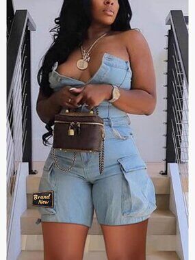 Strapless Denim Romper Cargo Shorts Slim Fit XXL One Piece Jumpsuit