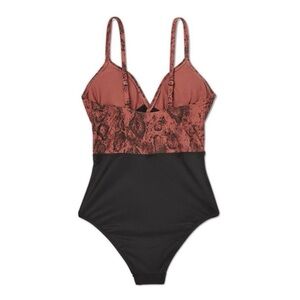 Snake-print, black and rust, sienna, burnt orange Wrap-front top creates cutout between bust and waist Deep V-neck and cutout front